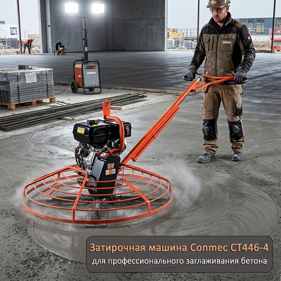 Conmec CT446-4 — это не просто затирочная машина, а проверенное решение для тех, кто считает не только первоначальную цену, но и совокупную стоимость владения. Усиленный редуктор, двигатель Honda промышленной серии, точная настройка угла лопастей и доступность расходных материалов делают эту модель оптимальным выбором для подрядных организаций, специализирующихся на устройстве бетонных полов в промышленном, гражданском и жилищном строительстве.