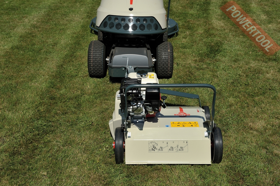 - Автономный прицепной вертикуттер подходит как для ручного толкания, так и в сочетании с трактором. В дополнение к серийновой рукоятке Cara 60 T также имеет дышло для закрепления за газонным трактором. Поскольку дышло асимметрично, скарификатор движется со смещением в сторону трактора, так что рыхление можно проводить вплоть до таких границ, как стены, заборы и т. д.