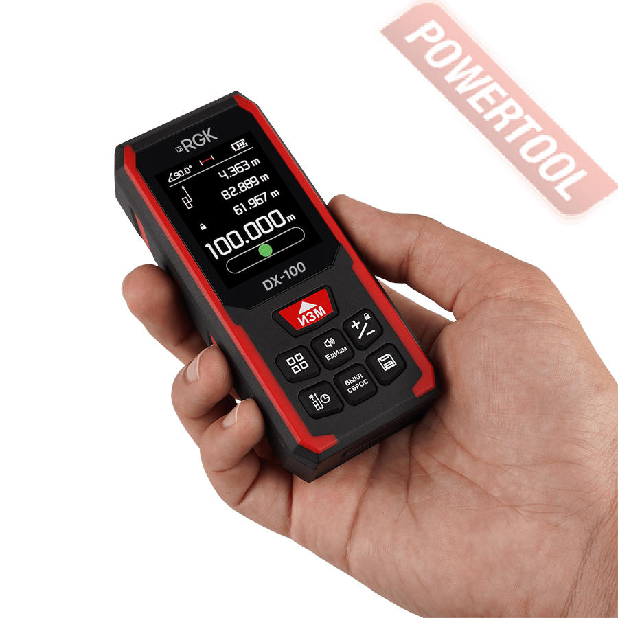 Одновременно с показателями измеренной дистанции, на экране в верхнем левой части высвечивается угловая величина, указывающая на текущий наклон инструмента. Лазерный дальномер RGK DX100 также может использоваться в качестве уровня для контроля горизонтальности поверхностей, отображая на экране индикатор, имитирующий работу ватерпаса с цилиндрической колбой. Поддерживается возможность крепления инструмента на штативе, перенос точки начала отсчета, отложенный запуск измерений по таймеру и самостоятельная калибровка. Режим измерений с разбивкой по точкам упрощает выполнение разметочных работ.