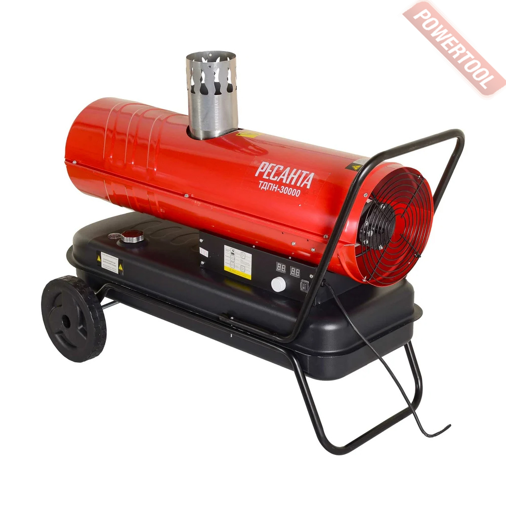 Дизельная тепловая пушка непрямого нагрева РЕСАНТА ТДПН-30000 - жидкотопливный нагреватель воздуха непрямого нагрева, характеризуются высокой эффективностью при обогреве больших помещений, обеспечивая чистый и теплый воздух. Применяется для обогрева закрытых помещений со средним уровнем вентиляции: магазинов, палаток, при проведении выставочных и развлекательных мероприятий. Тепловая пушка оптимальна для работы при строительстве, ремонте и эксплуатации жилых зданий и торговых площадей с вентиляцией. Широко применяется на строительных площадках для прогрева бетона при отрицательных температурах воздуха. Само устройство можно запустить и на улице. При внутреннем монтаже, обязательна подача свежего воздуха, так как процесс горения активно расходует кислород. Также внутренний монтаж в обязательном порядке предусматривает наличие дымоходной трубы на выходном газовом патрубке.