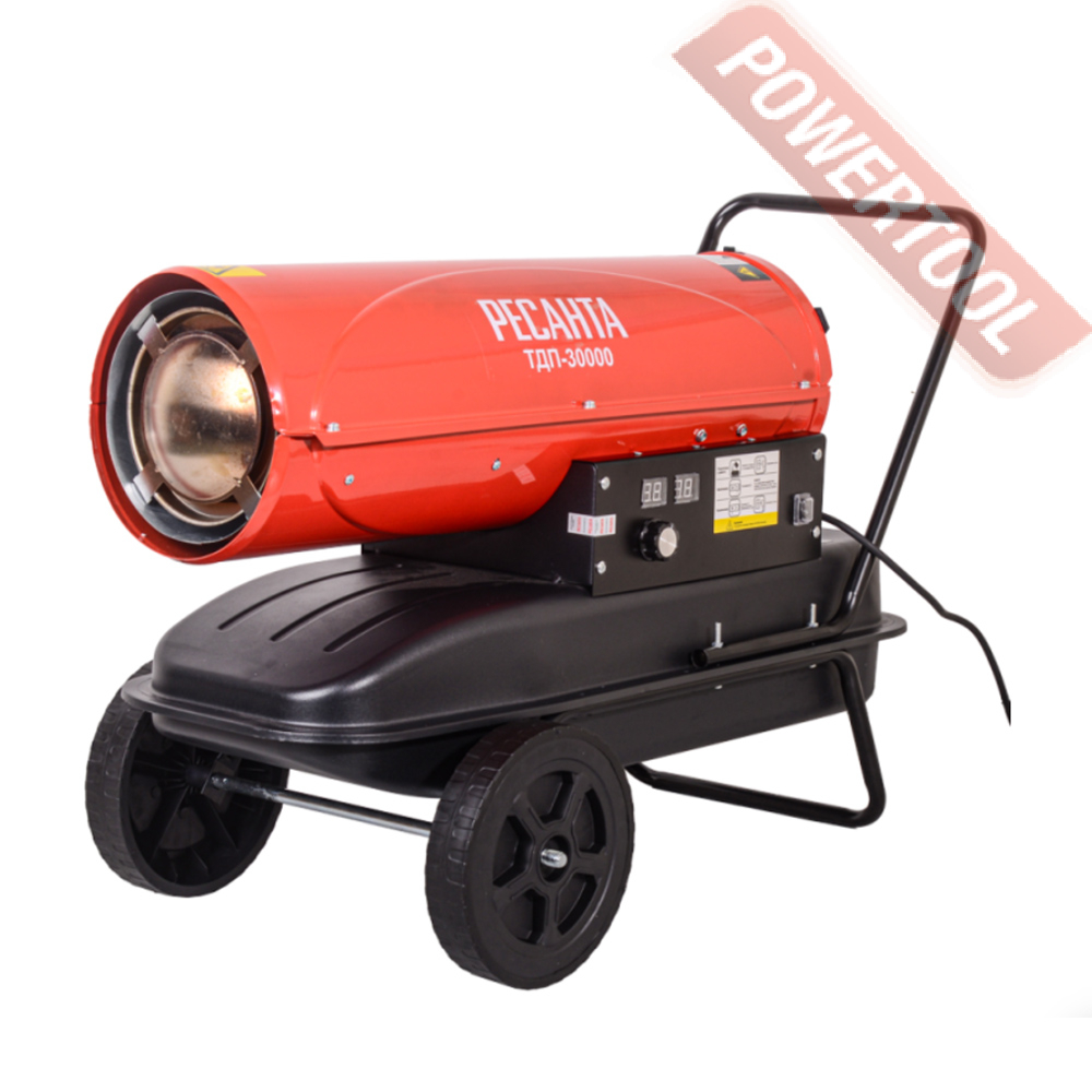 Дизельная тепловая пушка прямого нагрева, напряжение сети 220 В, тепловая мощность 30/35/40 кВт, расход воздуха 765 куб.м/ч, расход топлива 2,4/2,7/3 л/ч, объем топливного бака 38 л, потребляемая мощность 117 Вт, 3 режима работы, встроенный термостат, контроль пламени, датчик перегрева, датчик уровня топлива, время автономной работы до 12 ч, габариты ДхШхВ 1150х504х832 мм, вес 24,3 кг, тележечный комплект.