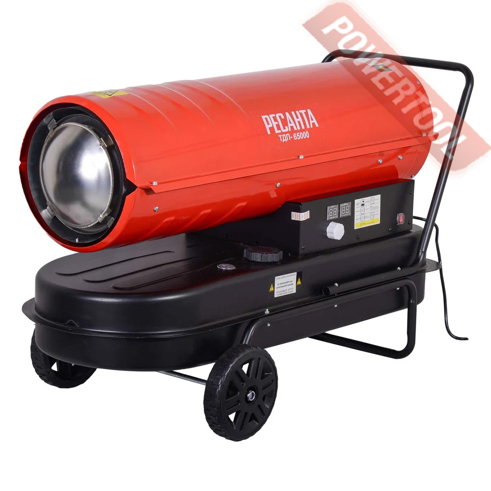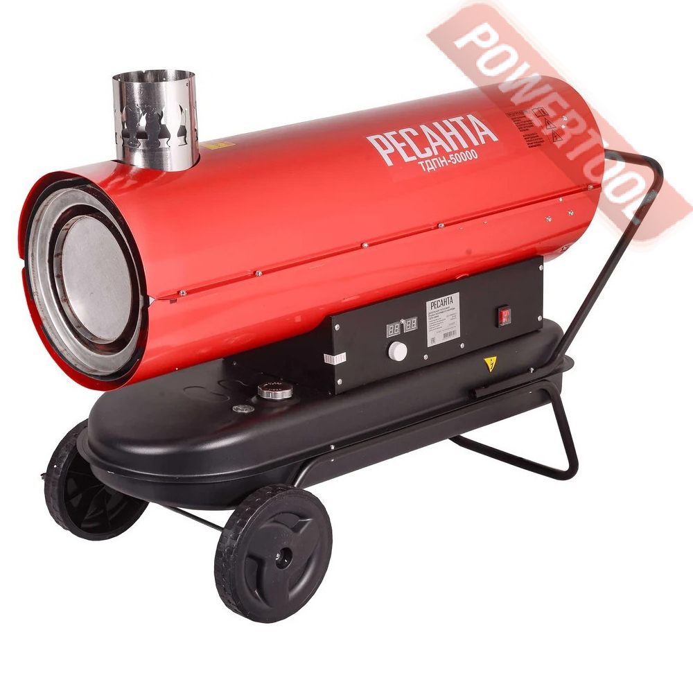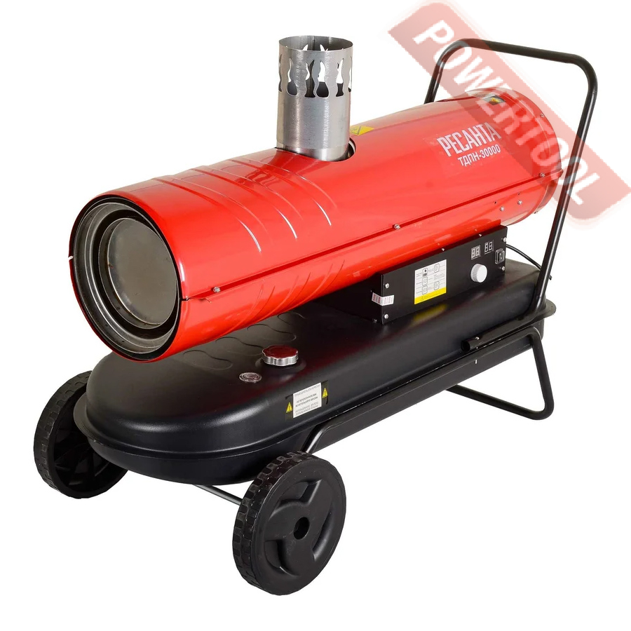 Дизельная тепловая пушка прямого нагрева ELITECH ТП 40ДП может применяться на открытых или хорошо проветриваемых объектах, например, на строительных площадках, заводах, в складских помещениях. Предназначена для высокопроизводительного обогрева нежилых помещений, прогрева бетона или грунта при строительных и ремонтных работах. За короткое время может обеспечить теплом большое пространство площадью до 232 кв.м. Открытая камера сгорания выбрасывает вредные продукты вместе с горячим воздухом, поэтому применять в закрытых помещениях с людьми её нельзя. Перемещение и ввод в эксплуатацию не требует особых усилий и знаний. Запуск осуществляется нажатием одной кнопки, после продува системы происходит поджиг и дизельное топливо начинает равномерно сгорать в камере, а вентилятор создает воздушный поток и выдувает теплые массы в окружающее пространство. Уже на первой минуте работы жидкотопливного нагревателя, ощущается высокий КПД системы. Установка этой машины должна происходить в помещениях с возможностью проветривания, давая тем самым выход продуктам сгорания. Так как в технологии изготовления применен процесс прямого нагрева, то вместе с прогретым воздухом из сопла выходят элементы горения. Если нагнетательное давление сбалансировано и форсунка настроена правильно, то выхлопов минимальное количество, копать и темный дым отсутствуют.