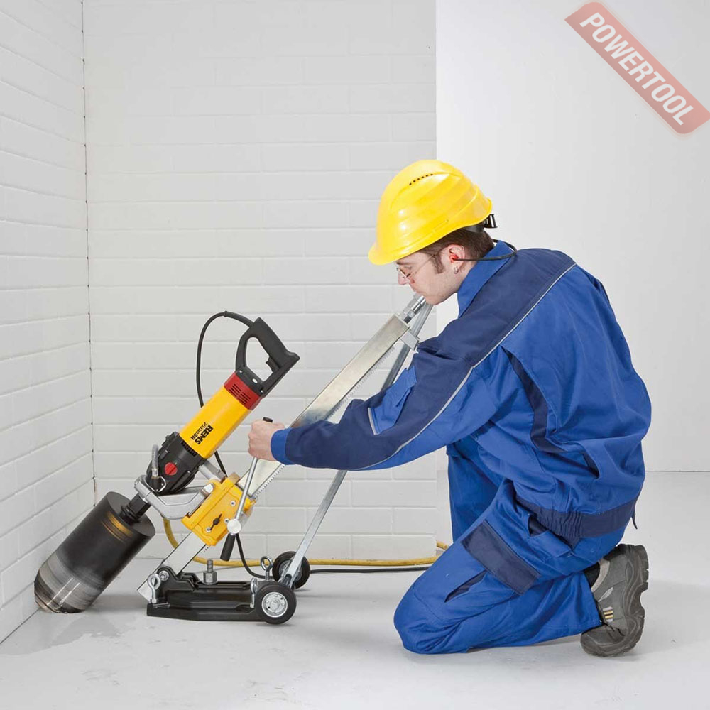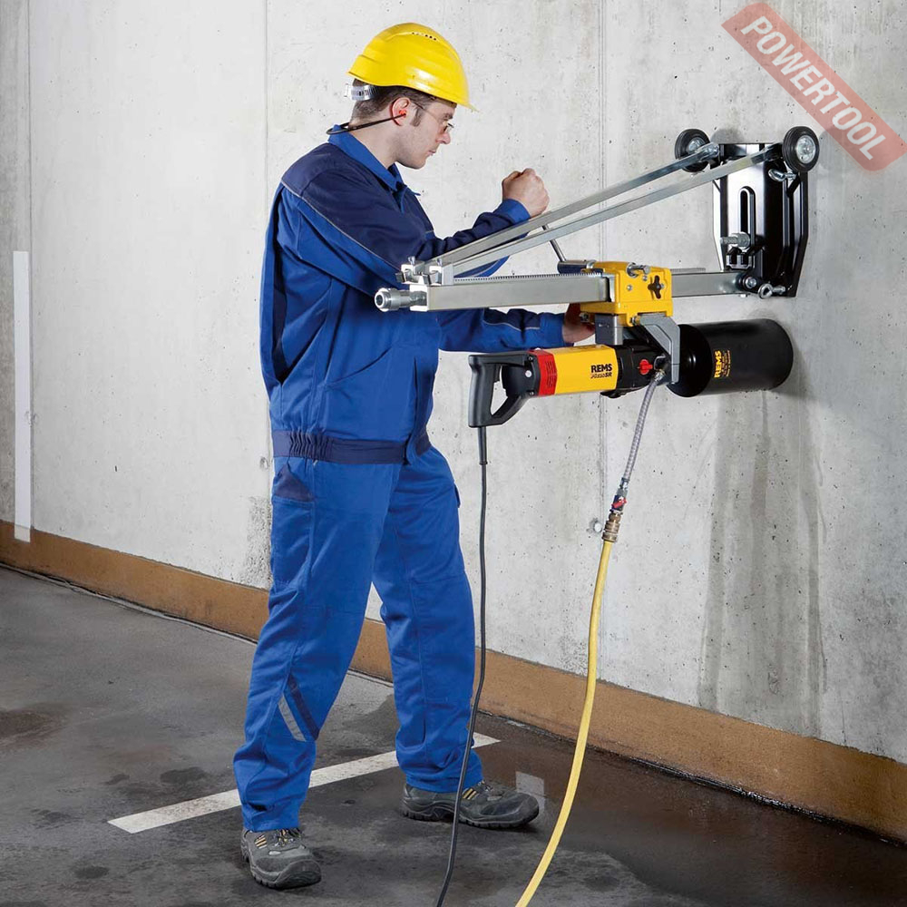Дрель алмазного бурения со стойкой REMS Picus SR Set Titan - электрический инструмент для кольцевого сверления алмазными коронками, с регулировкой скоростей. Для кольцевого сверления отверстий в бетоне, железобетоне диаметром до 162 (200) мм, кирпичной кладки и других материалов – до 250 мм. Для сухого и мокрого сверления, на весу или на стойке. Оснащена приводом с соединительной резьбой для установки алмазных коронок UNC 1 1/4 (наружной) и G 1/2 (внутренней), двухступенчатым редуктором, не требующим технического обслуживания с проскальзывающей муфтой безопасности. Универсальный двигатель мощностью 2200 Вт (220 В). Бесступенчатое электронное регулирование числа оборотов: от 250 об/мин до 500 об/мин (1 ход) либо от 600 об/мин до 1200 об/мин (2 ход). Защита от перегрева, мультифункционная электроника с мягким пуском, ограничитель числа оборотов на холостом ходу, защита от перегрузок, толчковый выключатель с фиксатором обеспечивают длительный срок службы оборудования.