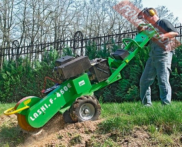 Измельчитель пней несамоходный LASKI F 460/18 применяется для уничтожения пней деревьев с возможностью проникновения фрезы на глубину 20 см ниже уровня земли. Минимальный диаметр пня не ограничен, но рекомендуется обрабатывать пни диаметром до 80 см - это связано с размерами оборудования. Рабочим органом является дисковая фреза с твердосплавными сменными ножами. Фреза крепится на раме, которая имеет возможность движения вверх-вниз и влево-вправо. Автоматический арретир подвижной верхней конструкции и простое управление максимально облегчают обращение с машиной. Принцип работы прост: оператор подъезжает к пню, блокирует колеса, включает фрезу, выбирает требуемую высоту и движениями влево-вправо с дальнейшим заглублением уничтожает пень.
