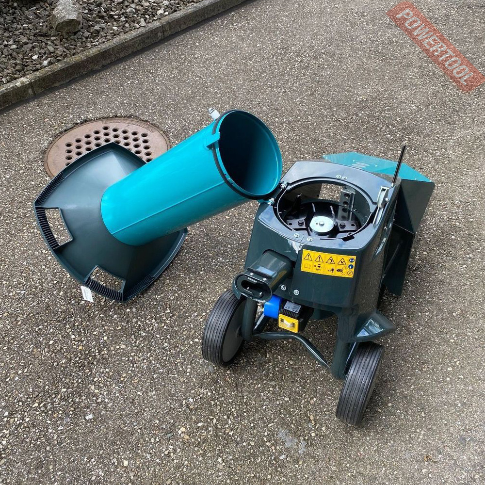 - Отличительной особенностью модели является двухкамерный приемник. Прямая воронка служит для мягкого материала, а боковая - для твердого. Агрегат способен измельчить ветки и разветвленные сучья диаметром до 40 мм.
