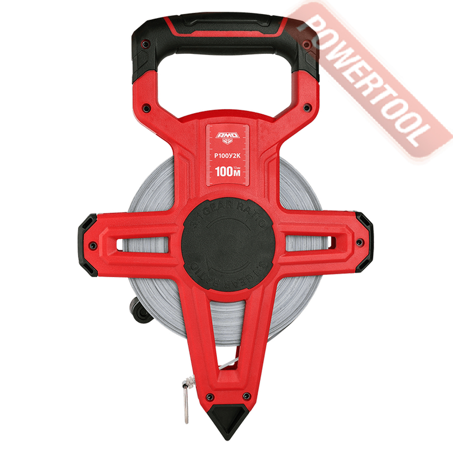 Открытый корпус, изготовленный из ударопрочного пластика с дополнительными накладками из термопластичной резины, за счет крестообразной формы надежно предохраняет измерительное полотно от физических воздействий при случайных ударах и падениях, и при этом обладает сравнительно небольшим весом. Верхняя часть измерительной рулетки для удобства удержания выполнена в виде закрытой ручки, а внизу предусмотрено заострение, позволяющее устанавливать инструмент над выбранной точкой. Вытяжной конец рулетки снабжен кольцом на торце для фиксации начала отсчета над выбранной точкой. Его можно также задействовать для крепления динамометра или груза, обеспечивая нормирование рабочего усилия натяжения измерительного полотна. Для ускорения сматывания стальной ленты служит редукторный механизм с ручным приводом.