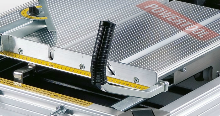 - Оборудуется многофункциональной рабочей поверхностью - кареткой. Этот узел принимает не меньше участия в процессе распиловки камня, нежели режущий механизм. Поверхность выполнена из рифленого из протянутого алюминия для обеспечения максимальной жесткости и легкости. Каретка плавно перемещается по салазкам на станине и имеет опорные ролики на закрытых шарикоподшипниках, что гарантирует длительный срок службы. Перемещение каретка осуществляется при помощи двух удобных рукояток, расположение которых максимально защищает руки оператора от случайного попадания под лезвие диска.