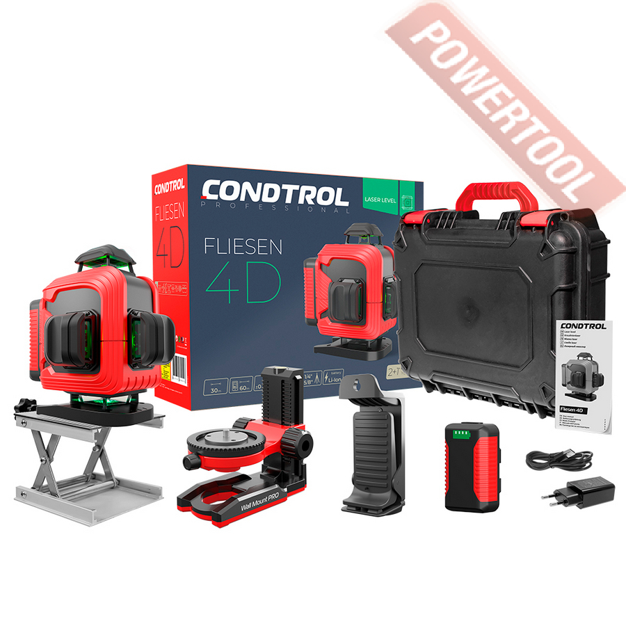 Лазерный уровень построитель плоскостей CONDTROL Fliesen 4D — многофункциональный, надежный и удобный инструмент, предназначенный для выполнения широкого спектра задач, требующих высокой точности разметки горизонтальных и вертикальных плоскостей. Он незаменим при выравнивании полов, укладке плитки, а также в отделочных, монтажных и строительных работах — как в помещении, так и на открытых строительных площадках.
