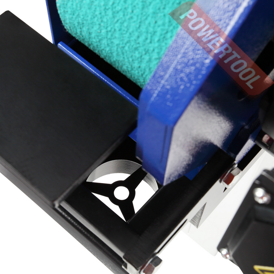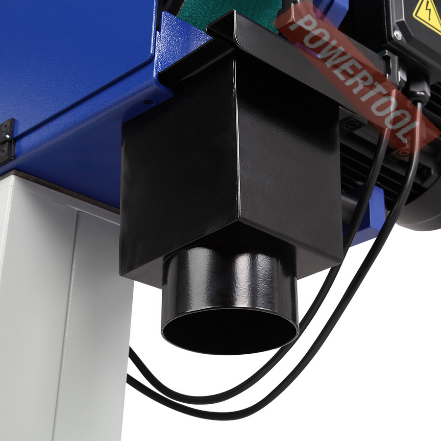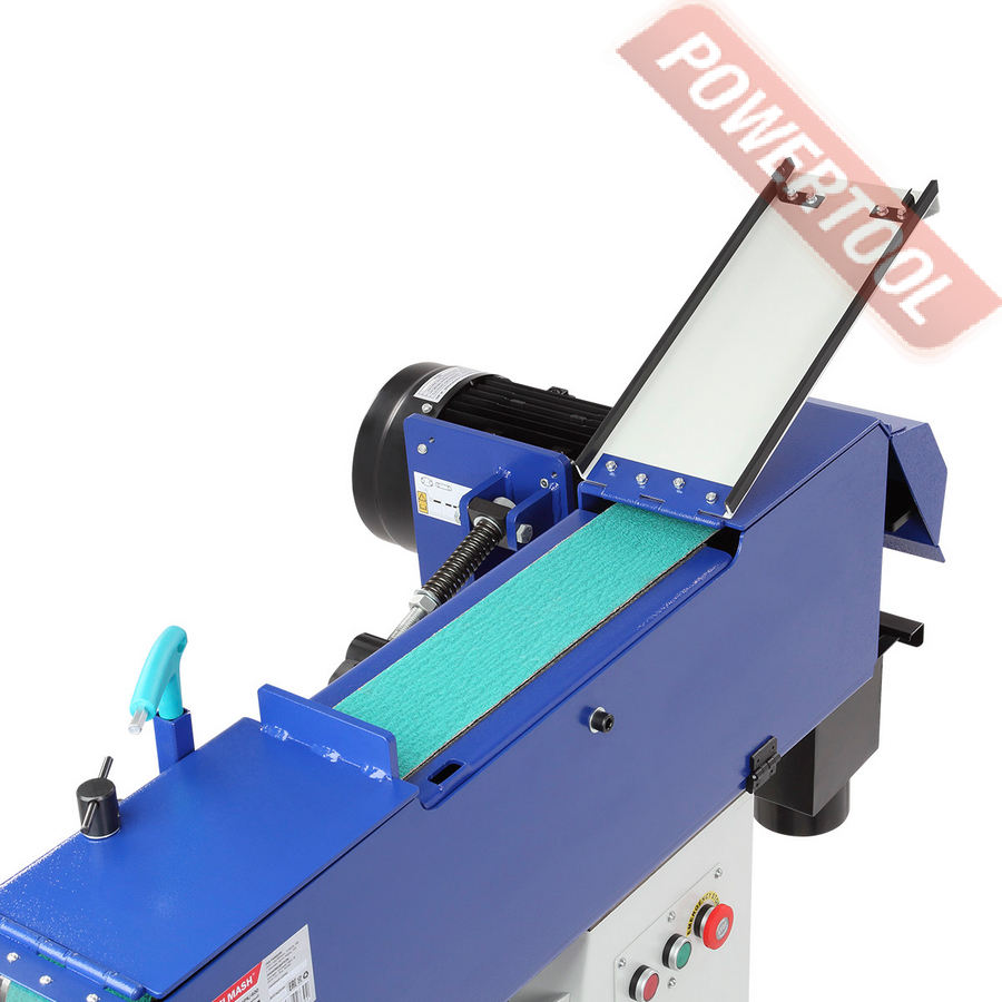 Замена шлифовальной ленты происходит быстро - для этого снимается верхняя крышка шкивов и боковая рама шлифовального узла. Регулируемый упор надежно удерживает заготовку при выполнении различных шлифовальных операций. Защитный экран способствует комфортной и безопасной работе. Станок оснащен двумя контейнерами для сбора отходов с патрубком, что дает возможность содержать рабочее место в чистоте. Контейнеры имеют специальные заглушки, которые при подключении вытяжной установки нужно снять.