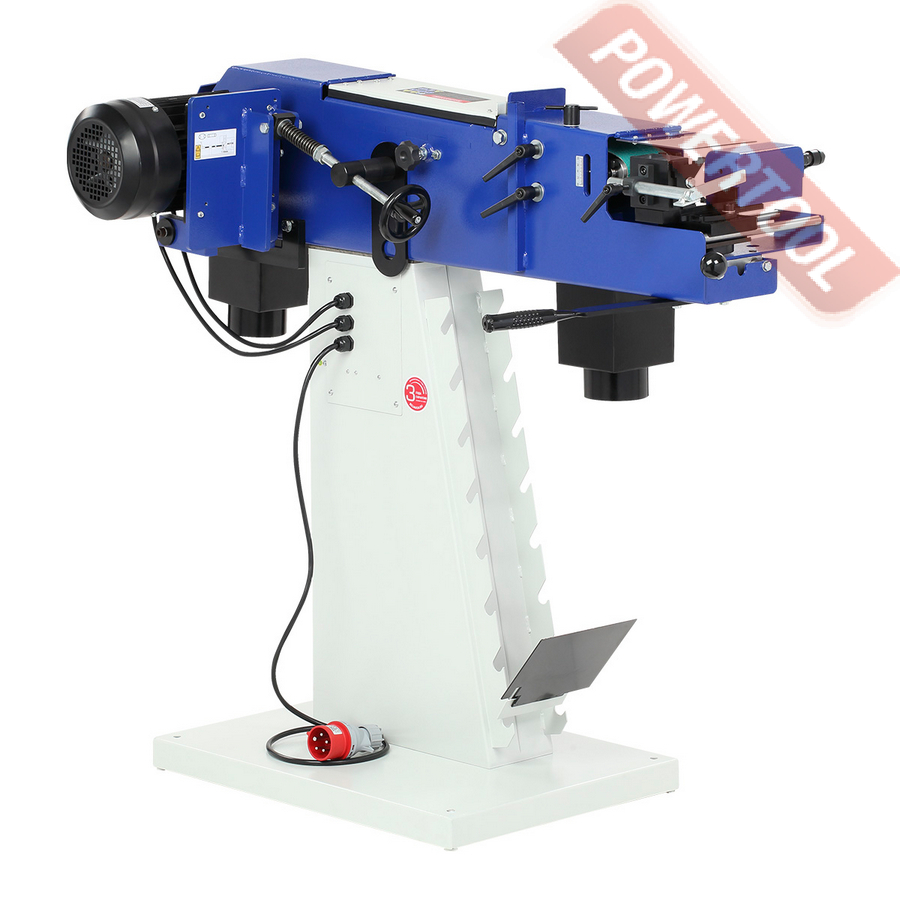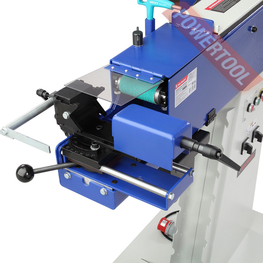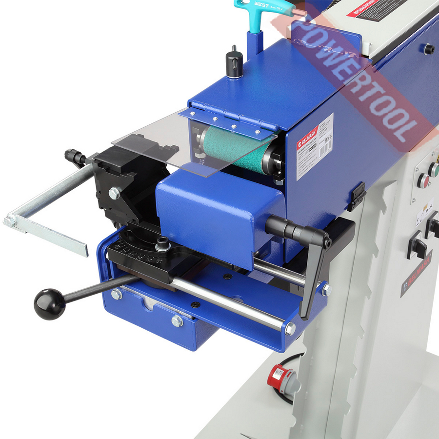 На станке возможна замена переднего направляющего ролика, на ролики диаметров 20, 26, 32, 42, 48, 60, 76 мм. Это позволяет производить радиусное скругление заготовки и подбирать нужный радиус при обработке. Конструкция опоры станка имеет специальные отсеки для удобного хранения роликов. На станке установлена шлифовальная лента размером 2000х98,5 мм и зернистостью 80 грит. Скорость движения шлифовальной ленты составляет 15 и 30 м/с. Применение шлифовальных лент разной зернистости позволяет использовать станок для обработки различных материалов. Частота вращения шлифовального барабана составляет 1400/2800 об/мин.