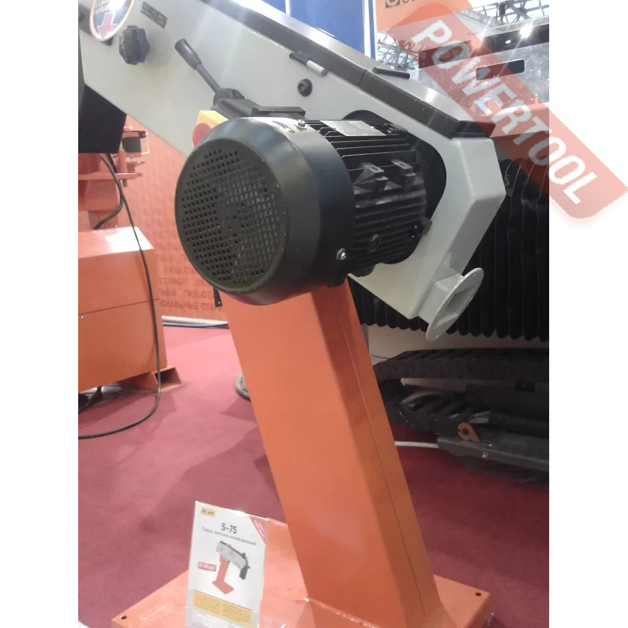 Ленточно-шлифовальный станок по металлу, мощность 3000 Вт, напряжение 220/380 В, шлифлента 75х2000 мм, скорость движения ленты 34 м/с, диаметр контактного ролика 200 мм, возможность подключения стружкоотсоса, диаметр отверстия для аспирации 75 мм, вес 75 кг, шлифлента.