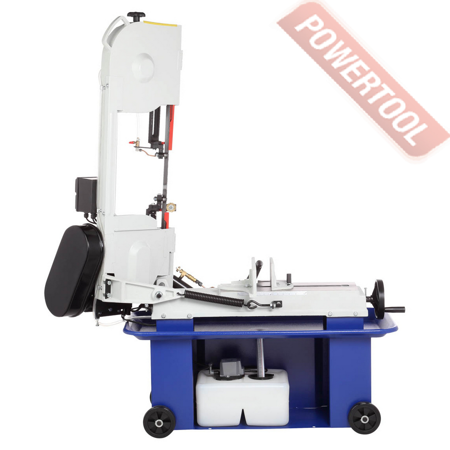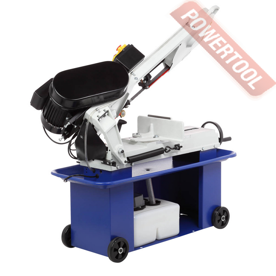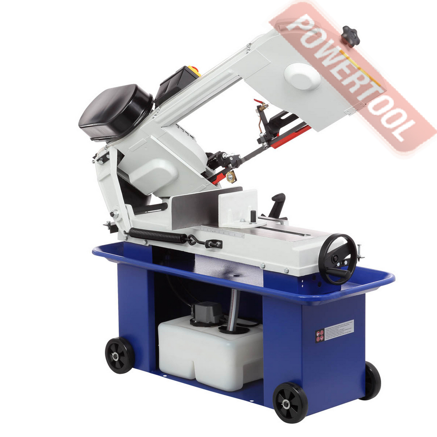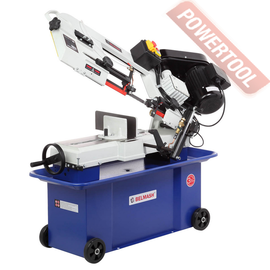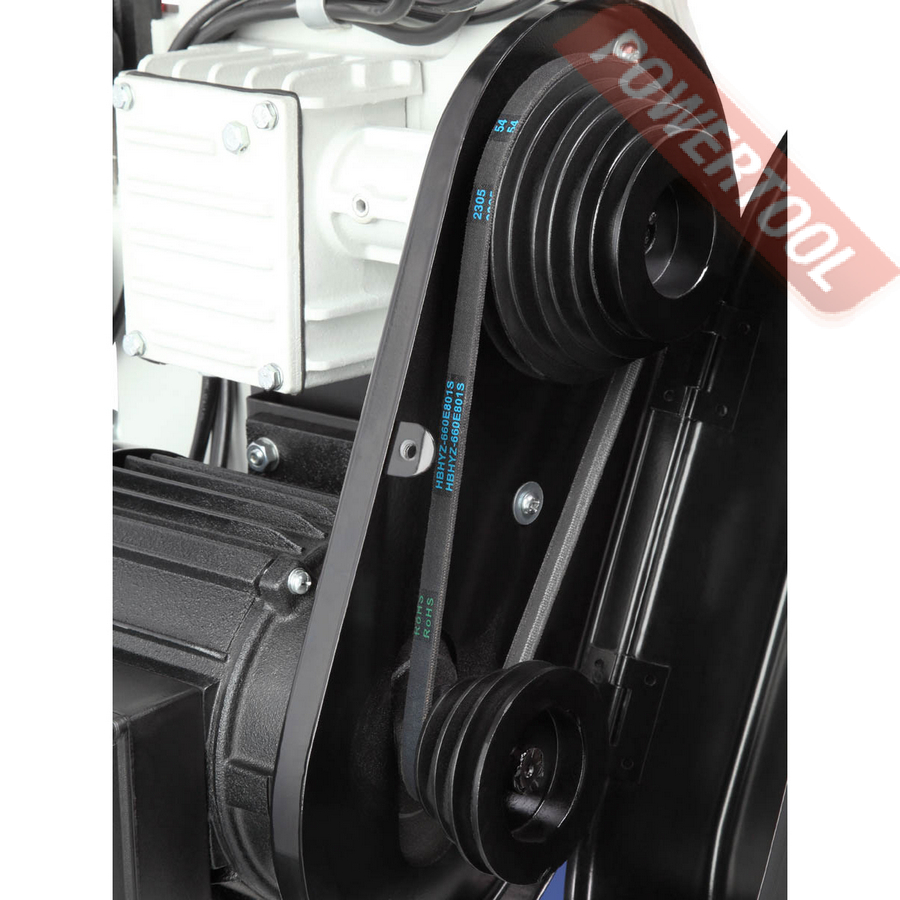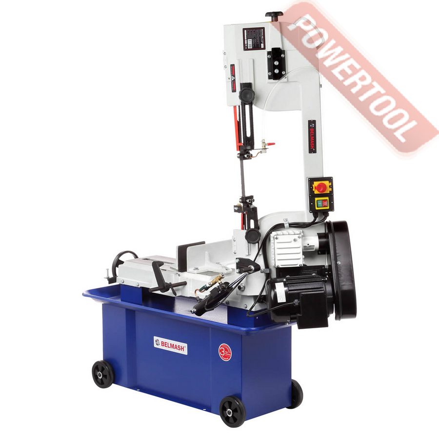 Двигатель асинхронный, с режимом работы S1 и потребляемой мощностью 1100 Вт. Станок работает от сети 400 В. У станка четыре скорости вращения пильного полотна: 22/33/45/65 м/мин. Они переключаются путём перекидывания клинового ремня. Натяжение полотна осуществляется специальной ручкой.