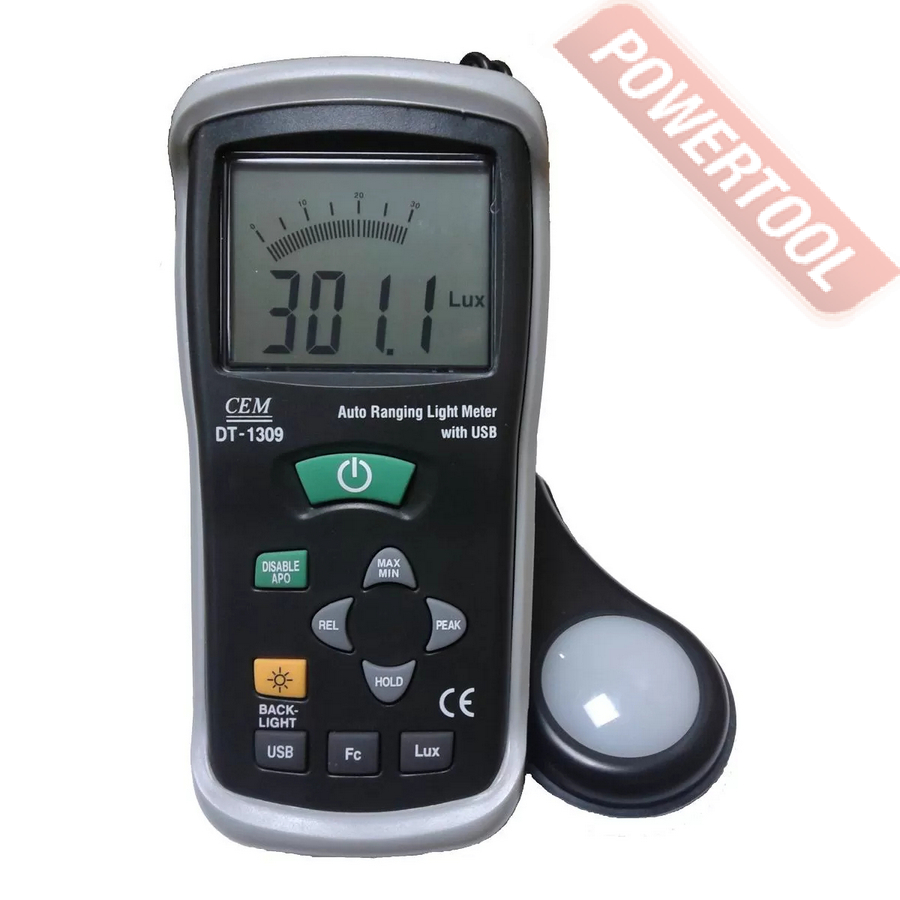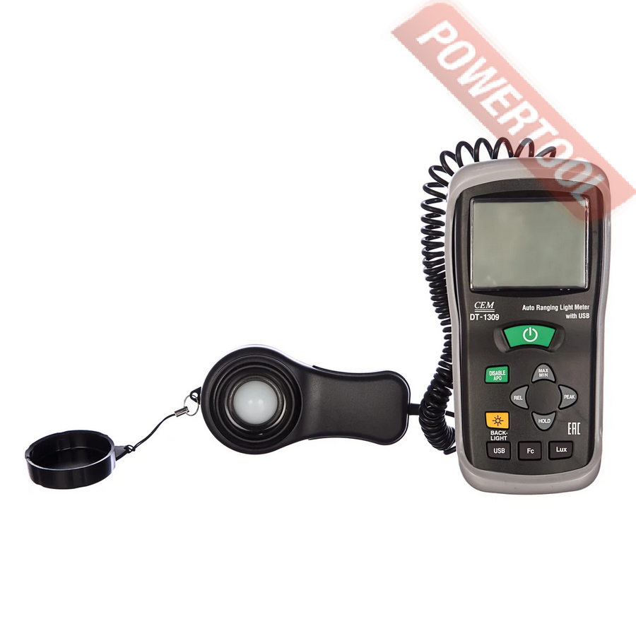 Люксметр CEM DT-1309 подключается к ПК через USB порт для детального формирования отчета. В случае 20-минутного бездействия оператора модель самостоятельно отключается для экономии заряда батареи. При перегрузке на дисплее прибора отображается знак OL. В качестве фотодатчика используется кремниевый фотодиод. Коррегирующий фильтр гарантирует его стабильную работу. Шнур фотодатчика длиной 150 см позволяет измерять уровень освещенности на расстоянии от прибора. Масса инструмента составляет 390 граммов.