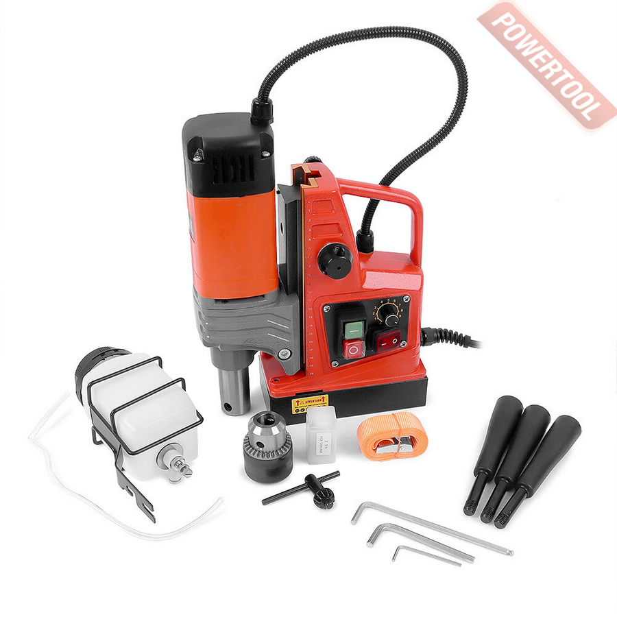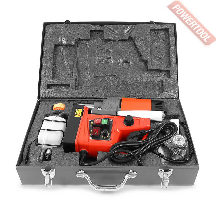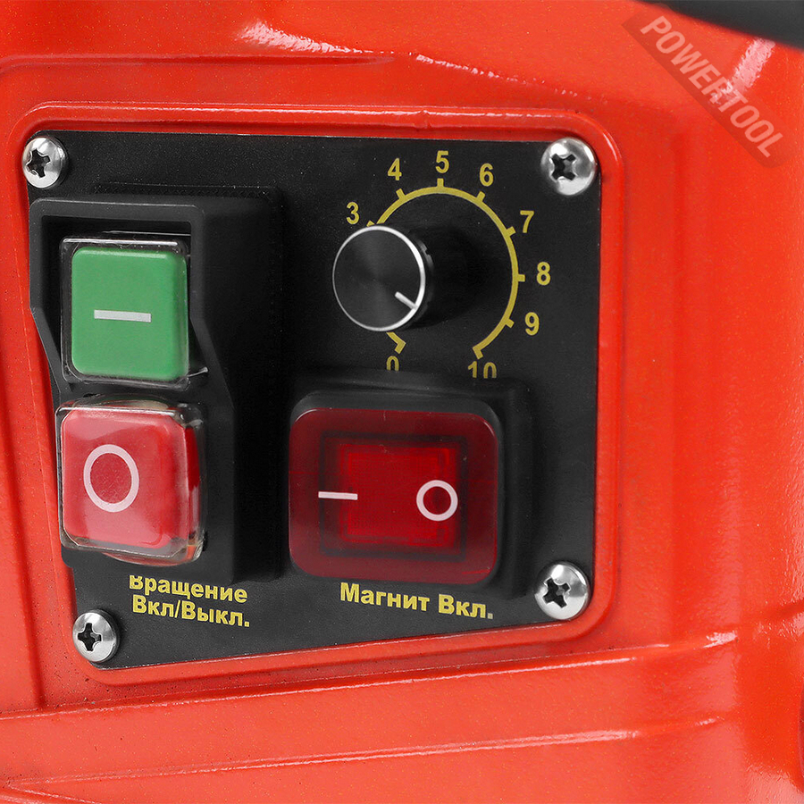 Магнитный сверлильный станок, 1500 Вт, 220 В, max диаметр корончатого сверла 50 мм, max диаметр спирального сверла 13 мм, крепление корончатого сверла на Weldon 19, ход шпинделя 220 мм, частота вращения шпинделя 0-600 об/мин, 1 скорость, плавный пуск, поддержание оборотов под нагрузкой, прижимная сила 13000 Н, вес 15,7 кг, патрон и адаптер для спиральных сверл, система подачи СОЖ, в комплекте система охлаждения, страховочный ремень, рукоятка подачи 3 шт, набор шестигранников, кейс.