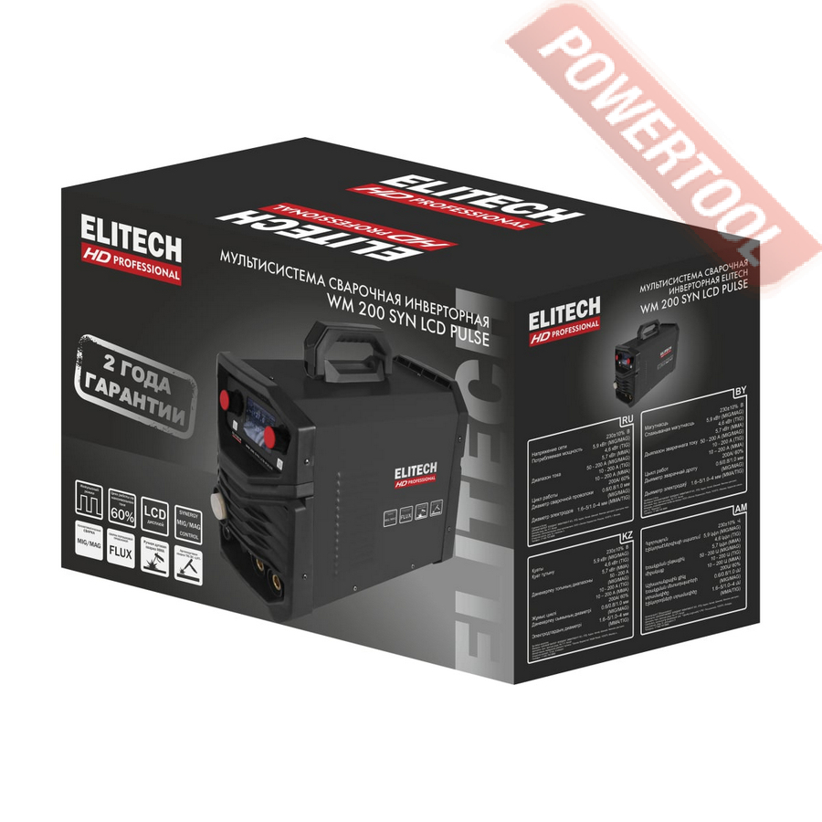 - 1. Многофункциональный MIG-MAG-MMA-TIG инверторный сварочный аппарат ELITECH HD WM 200 SYN LCD Pulse.