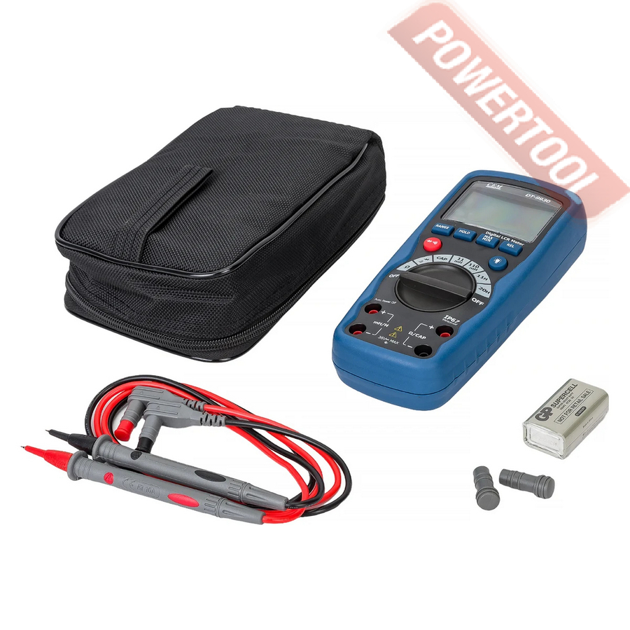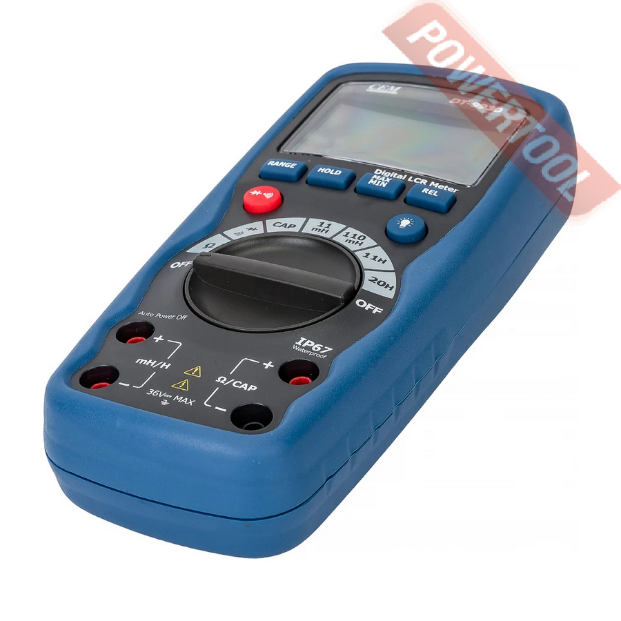 Цифровой мультиметр и LCR-метр, автоматический, диапазон измерения сопротивления от 110 Ом до 110 МОм, диапазон измерения емкости от 11 нФ до 110 мФ, диапазон измерения индуктивности от 11 мГн до 20 Гн, ЖК-дисплей, проверка диодов, целостности цепи, функция min/max, функция Hold, функция Rel, питание от 1 батарейки 9В тип Крона, класс защиты от влаги и пыли IP67, габариты ДхШхВ 150х70х48 мм, вес 0,255 кг, элементы питания, щупы.