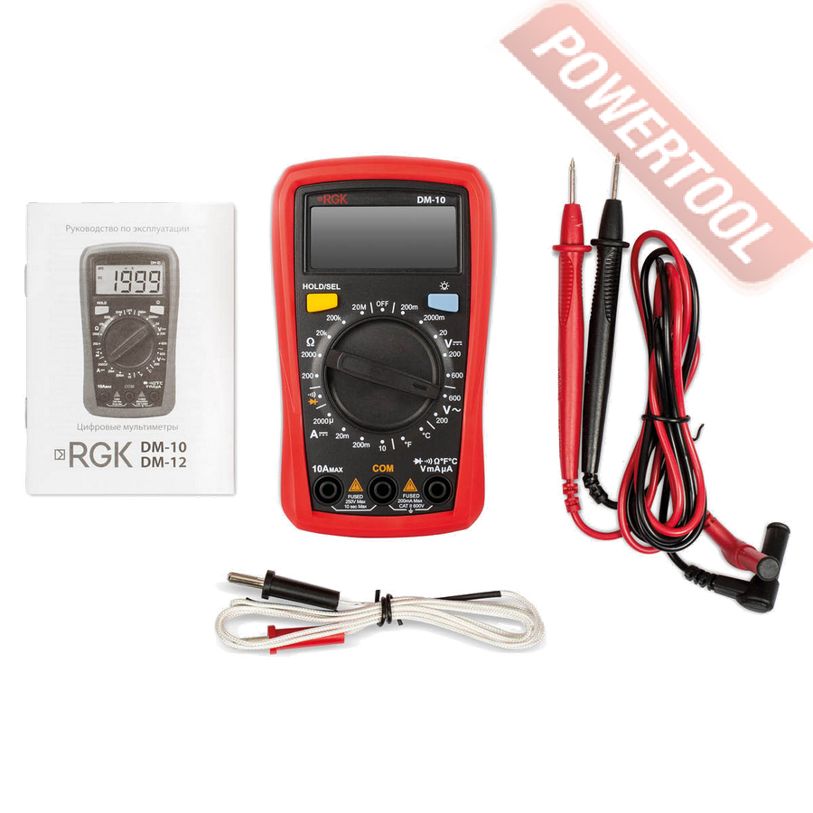 Мультиметр цифровой с поверкой RGK DM-10 – это прибор для измерения различных параметров электросетей, диагностики оборудования, проверки диодов на работоспособность и прозвонки цепей. При подключении комплектной или любой другой термопары типа “К” эта модель может проводить замеры температуры вплоть до 600 градусов С. За счет небольших размеров и легкости освоения основных функций, мультиметр станет отличным выбором для домашнего использования.