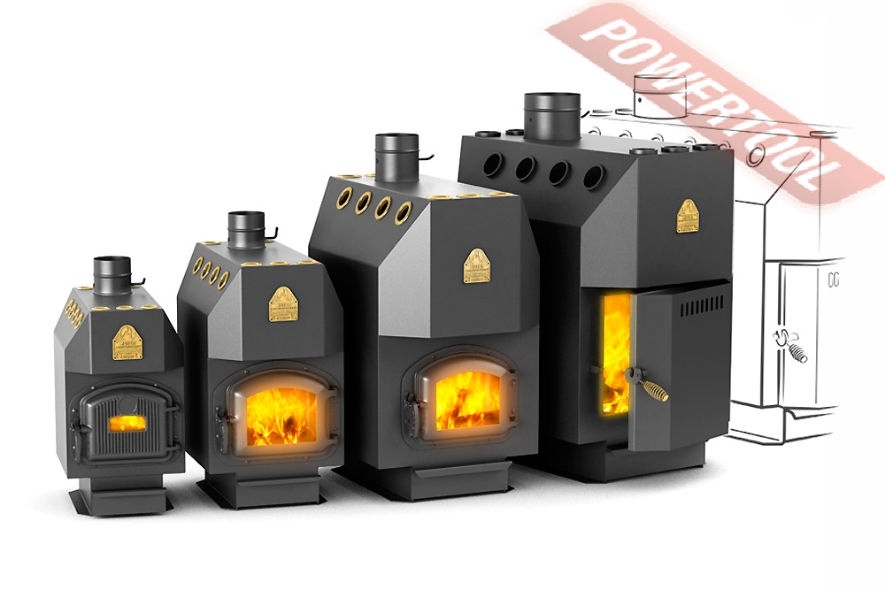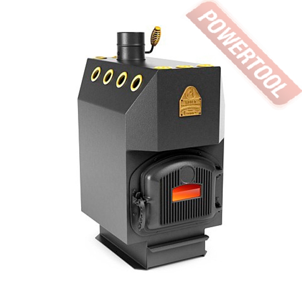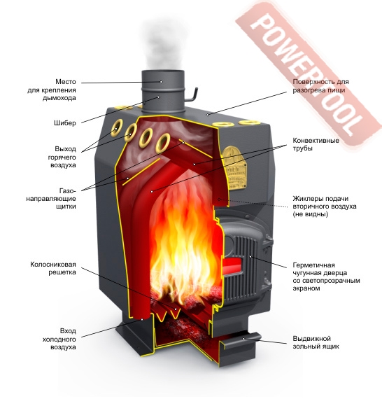- Котел состоит из конвективных труб, окружающих топочною камеру. Их поверхность эффективно используется для передачи тепла, циркулирующему по ним воздуху отапливаемого помещения. Специально организованный лабиринт из конвективных труб и газонаправляющих экранов в верхней зоне топочной камеры позволяет более полно использовать тело уходящих в дымоход газов. Эта система состоит из герметично закрепленных, между верхней крышкой и днищем корпуса, труб с открытыми торцами. По боковым сторонам камеры идут изогнутые трубы, перекрещивающиеся вверху, а в задней и передней частях топочной камеры &ndash прямые. Трубы полностью находятся под волздействием пламени, также в процесс теплообмена включены передняя и задняя стенка печи. Входные отверстия конвективных труб находятся на возвышении от уровня пола, что благоприятно для свободной конвекции воздуха нагреваемого воздуха. Специльные жиклеры подают горячий воздух для дожигания уходящих гаов.