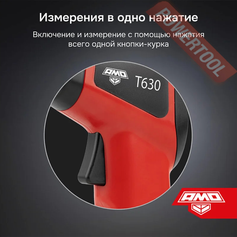 Нажатие курка на пистолетной рукоятке AMO T630 активирует режим непрерывных измерений SCAN. После его отпускания срабатывает функция HOLD. Она фиксирует последний цифровой показатель на дисплее для упрощения считывания результатов измерений.