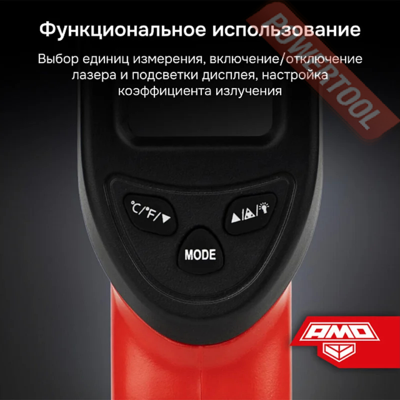 Кнопки управления, предназначенные для активации дополнительных функций, расположены под дисплеем – комфортно для нажатия большим пальцем руки, удерживающей пирометр за пистолетную рукоятку. С их помощью выполняется выбор размерности результатов измерений в С или F, включение и выключение подсветки экрана и лазерного излучателя, а также задание показателя EMS.