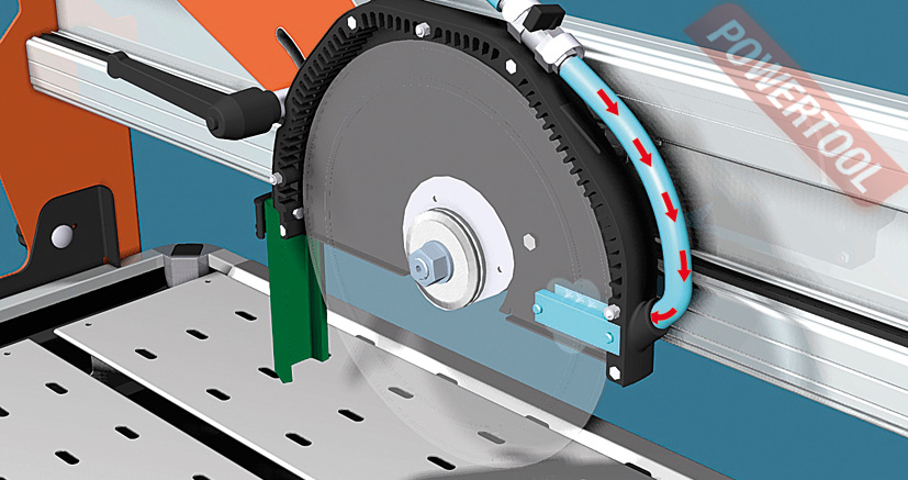 SPRAY SYSTEM - это система подачи воды на алмазный диск. Вода направлена на три важных точки алмазного диска: спереди и с обоих боков режущей кромки. Обладает высокой эффективностью даже при резке по углом 45 градусов. Предотвращает образование пыли при резке и увеличивает срок службы алмазного лезвия,создавая поток воды внутри кожуха диска.