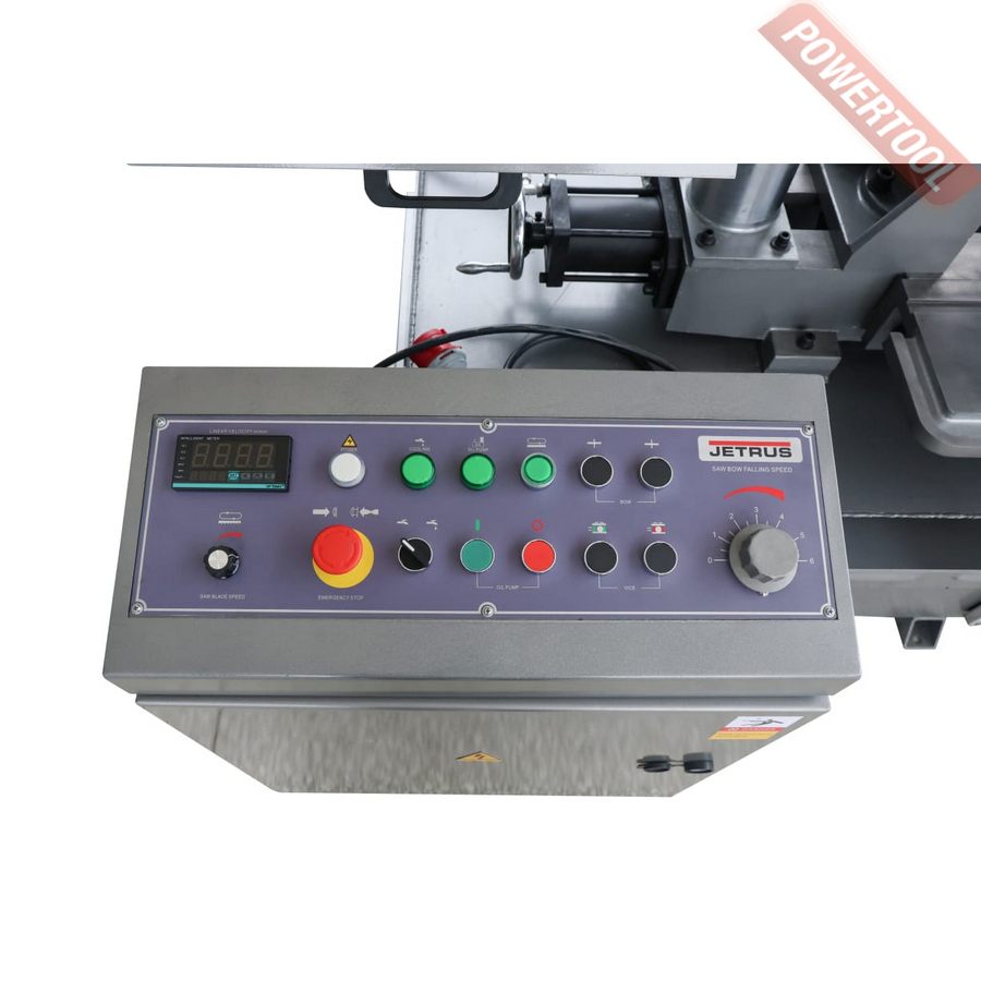Скорость движения ленточного полотна плавно регулируется в пределах от 0 до 70 м/мин. Плавная регулировка скорости движения ленточного полотна позволяет подобрать нужный режим пиления и повысить качество производимой детали. Скорость устанавливается потенциометром на пульте управления и отображается на цифровом табло частотного преобразователя, который поддерживает необходимую скорость при изменении нагрузки.