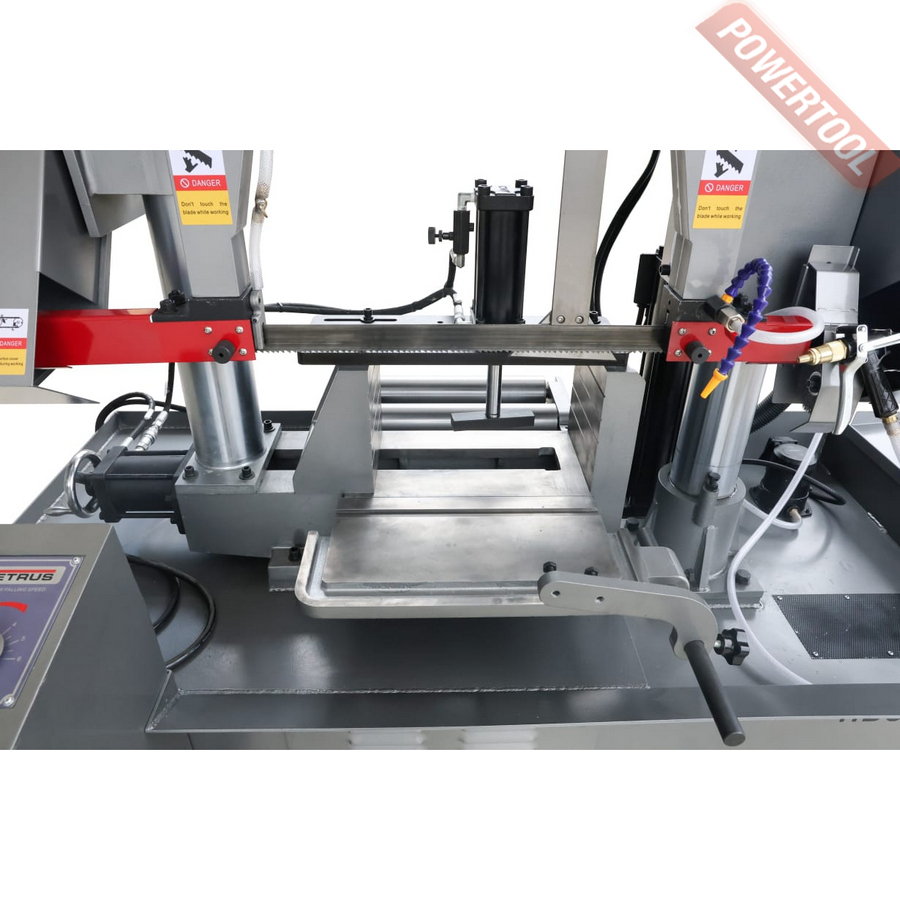 Станок оснащен гидравлической системой подъема и опускания пильной рамы с плавной регулировкой скорости подачи с пульта оператора для выбора оптимального режима резания. По окончании пиления, концевой выключатель останавливает движение ленточного полотна, пильная рама поднимается в исходное положение для осуществления циклических операций.