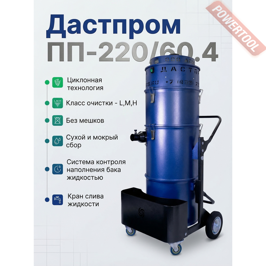 Пылесос промышленный ДАСТПРОМ ПП-220/60.4-3 - универсальный пылесос, предназначенный для уборки больших площадей от любого вида мусора, воды, негорючих жидкостей, масел, клейких фракций, металлической стружки и окалины, любой невзрывоопасной мелкодисперсной пыли.