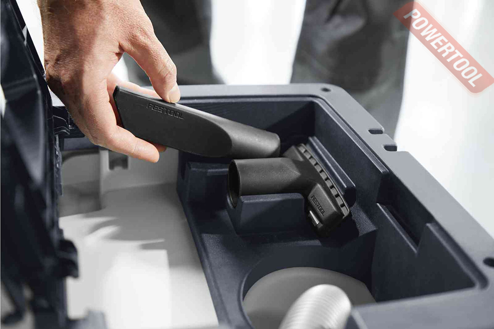 - Розетка для электроинструмента. На корпусе строительного пылесоса расположена розетка, которая служит для подключения внешних электроинструментов с целью обеспечения синхронной работы с инструментом и автоматического включения/отключения пылесоса.