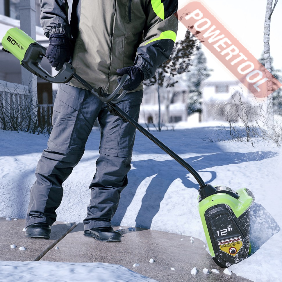 - Снегоуборщик работает от аккумулятора серии 60V, который можно использовать с другими устройствами линейки 60V..