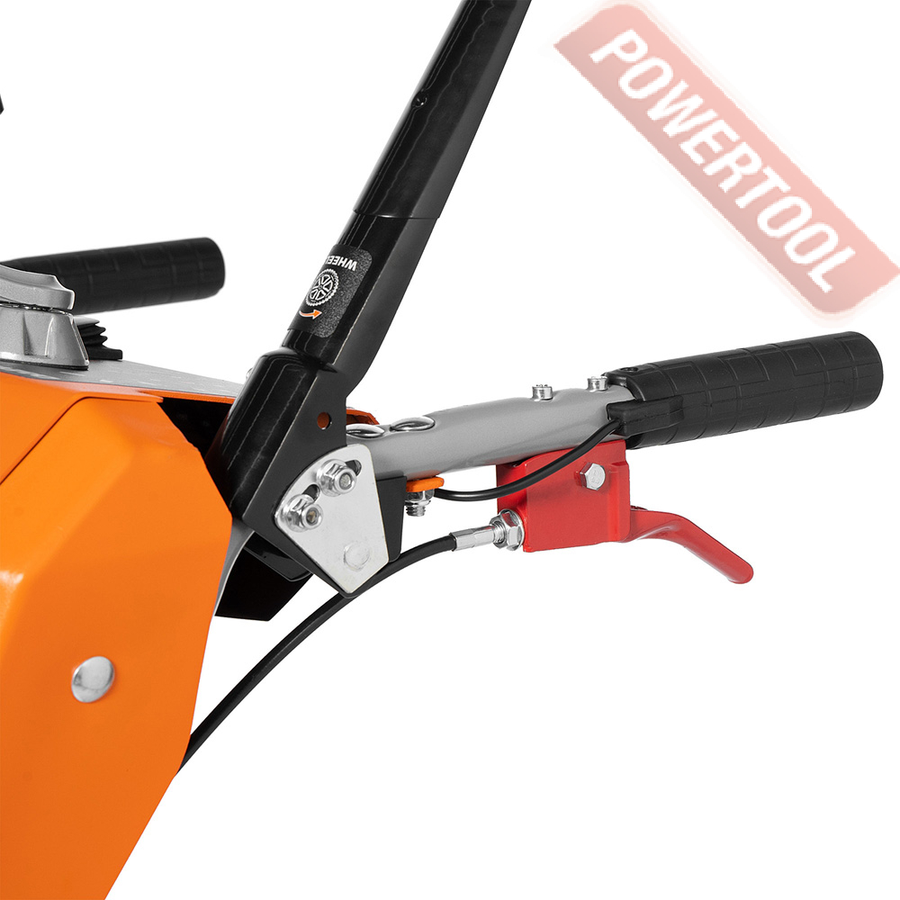 - Взаимная блокировка рукояток. Нажатие 2-х рукояток приводит к их взаимной блокировке. Это позволяет управлять снегоуборщиком даже одной рукой, в том числе изменять направление выброса снега без остановки работы.
