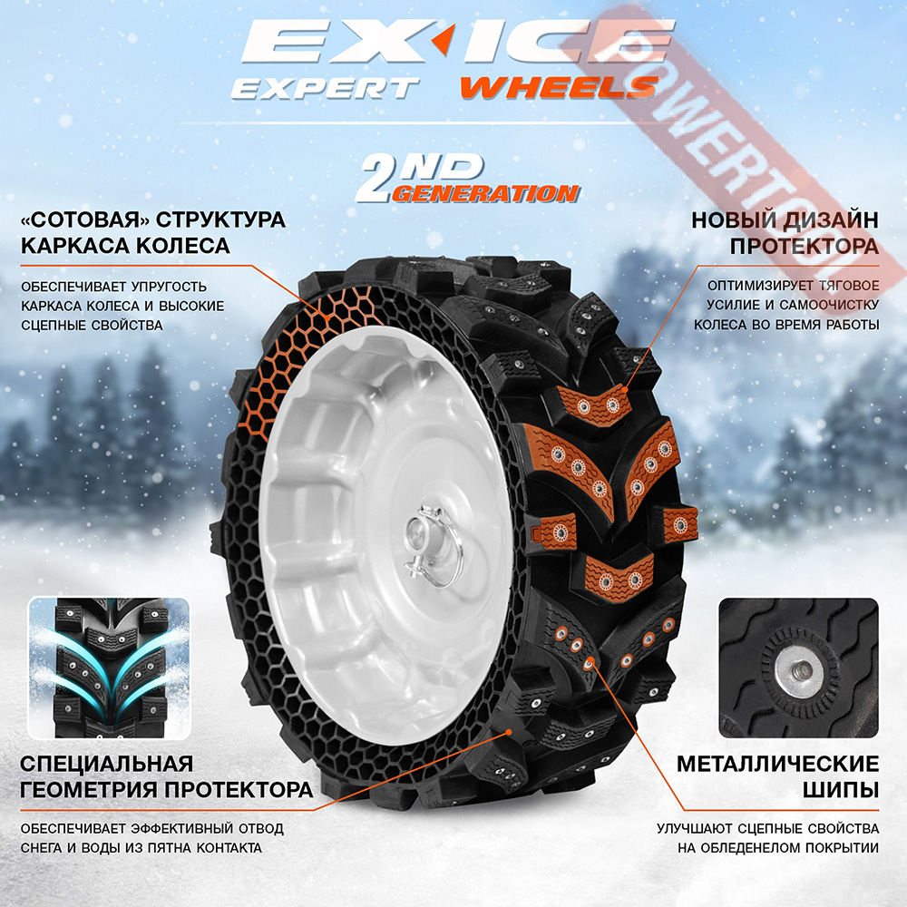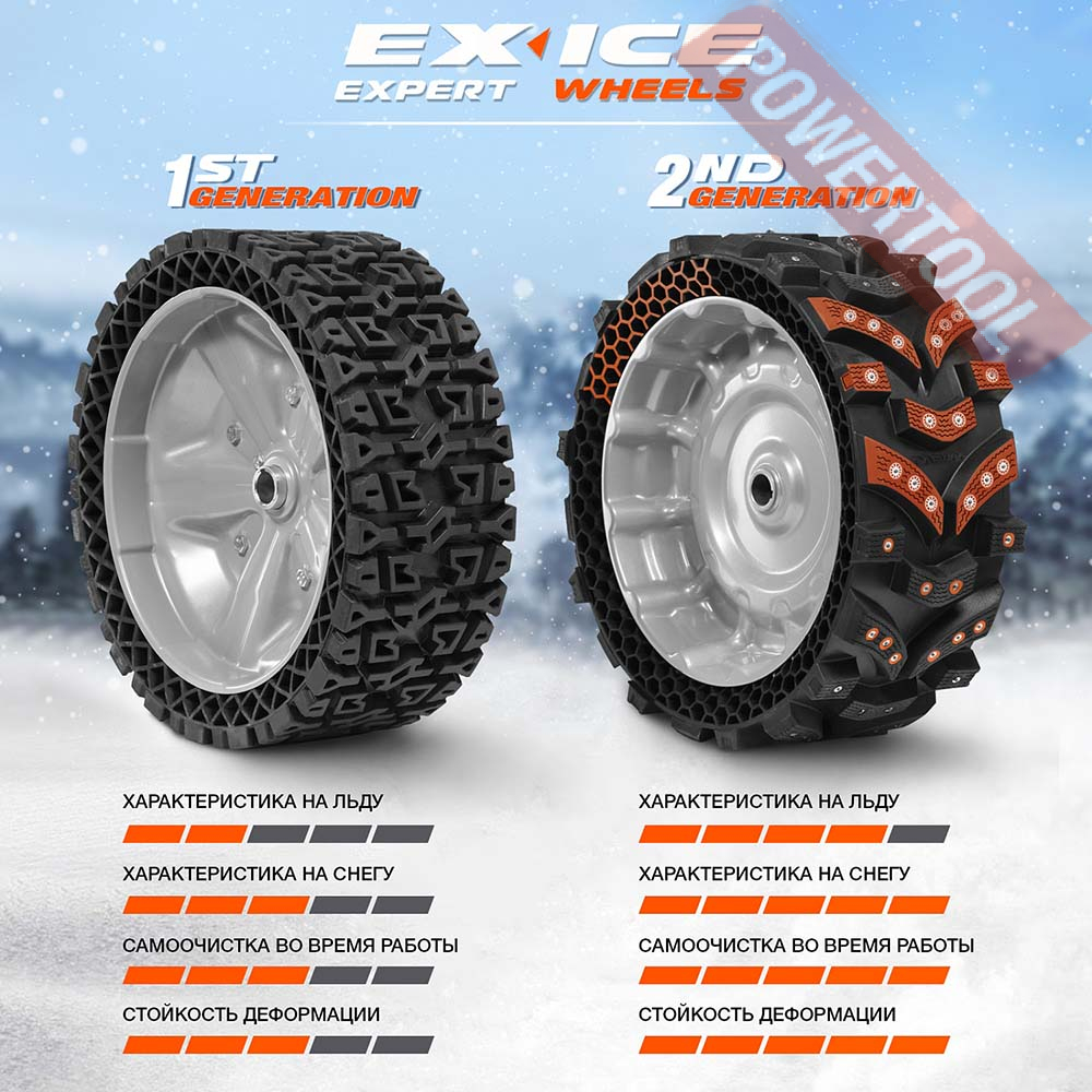 - Уникальные колеса EX‑ICE WHEELS. Широкие безвоздушные колеса созданы специально для снегоуборщиков. Колеса EX‑ICE обладают лучшим сцеплением с поверхностью среди всех зимних шин. Лучшая проходимость и маневренность в классе снегоуборщиков.