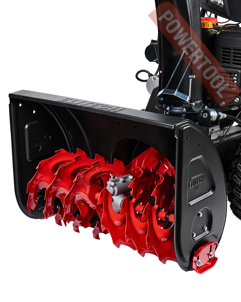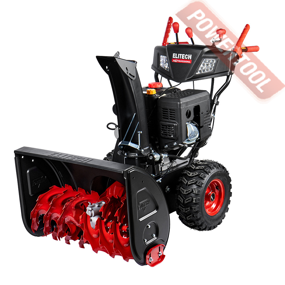 Снегоуборщик колесный самоходный ELITECH HD ST 1271LE с двух ступенчатой системой выброса снега. Используется для уборки снега с дорожек, тротуаров и других участков, с выбросом снега в сторону. Снегоуборочная машина оснащена бензиновым 4-тактным двигателем OHV коммерческого уровня, с ручным запуском и запуском от электросети. Спереди снегоуборочной машины расположен ковш с вращающимся шнегом для забора снега и последующего его выброса в сторону через разгрузочный желоб. Направление выброса снега регулируется на 190 градусов. Модель оснащена LED фарами, что облегчает её использование при эксплуатации в темное время. Эргономичная приборная панель. Подогрев рукояток.