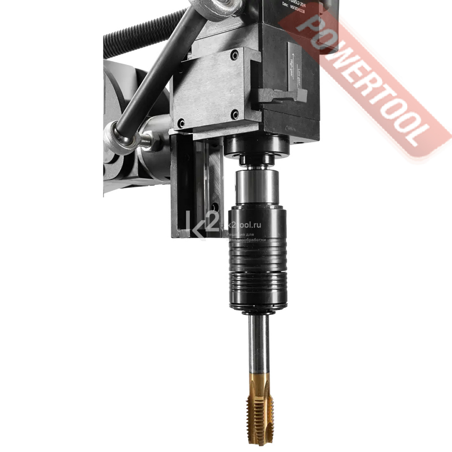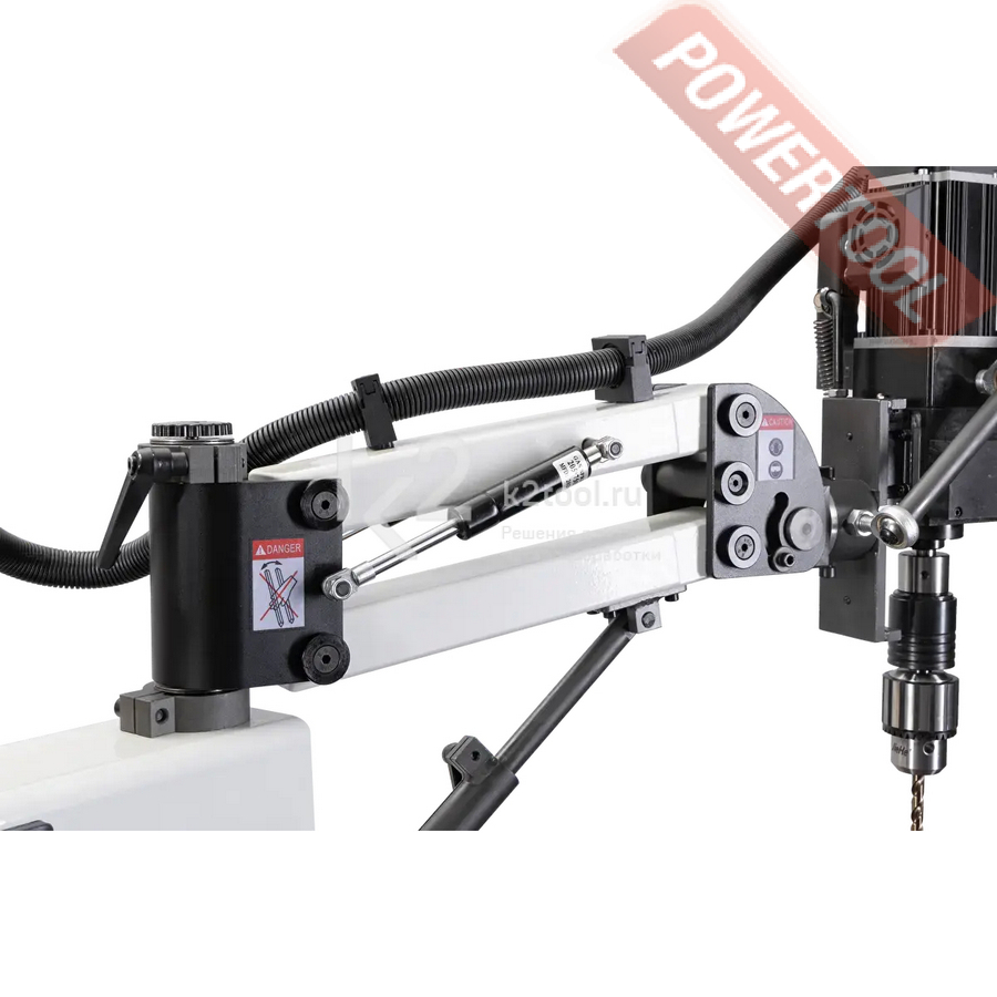 Сверлильно-резьбонарезной манипулятор, 1200 Вт, 220 В, max диаметр сверления 16 мм, max нарезаемая резьба M24, частота вращения шпинделя 0-1500 об/мин, 2 передачи, бесступенчатая регулировка оборотов, индикация числа оборотов, режимы ручной/авто/нарезка глубокой резьбы, посадочное сверлильного патрона B16, диапазон хвостовиков для патрона 3-16 мм, рабочий радиус поворота рычага 920 мм, габариты ДхШхВ 850х720х350 мм, вес 77 кг, в комплекте патрон ключевой B16 3-16 мм, оправка GTM-24/B16, набор резьбонарезных головок GTM-24 DIN 371 М5-М6/М8/М10, DIN 376 М12/M16/M18/M22-M24 с ключом, стойка опорная, крепежные принадлежности.