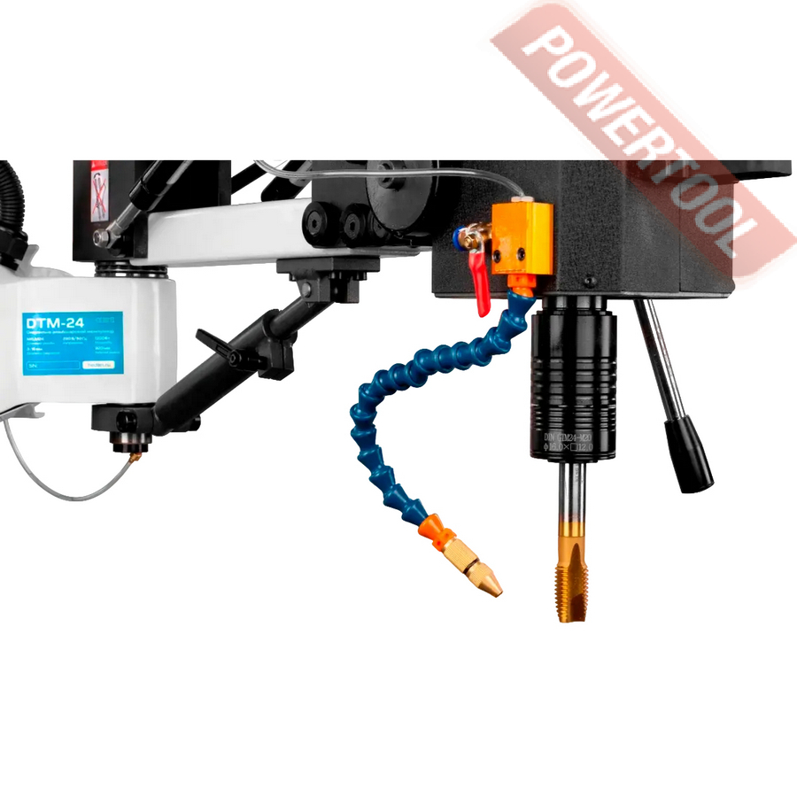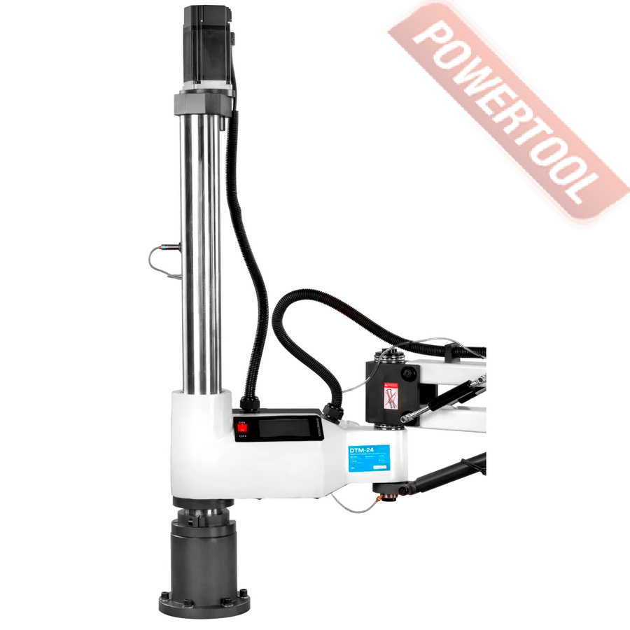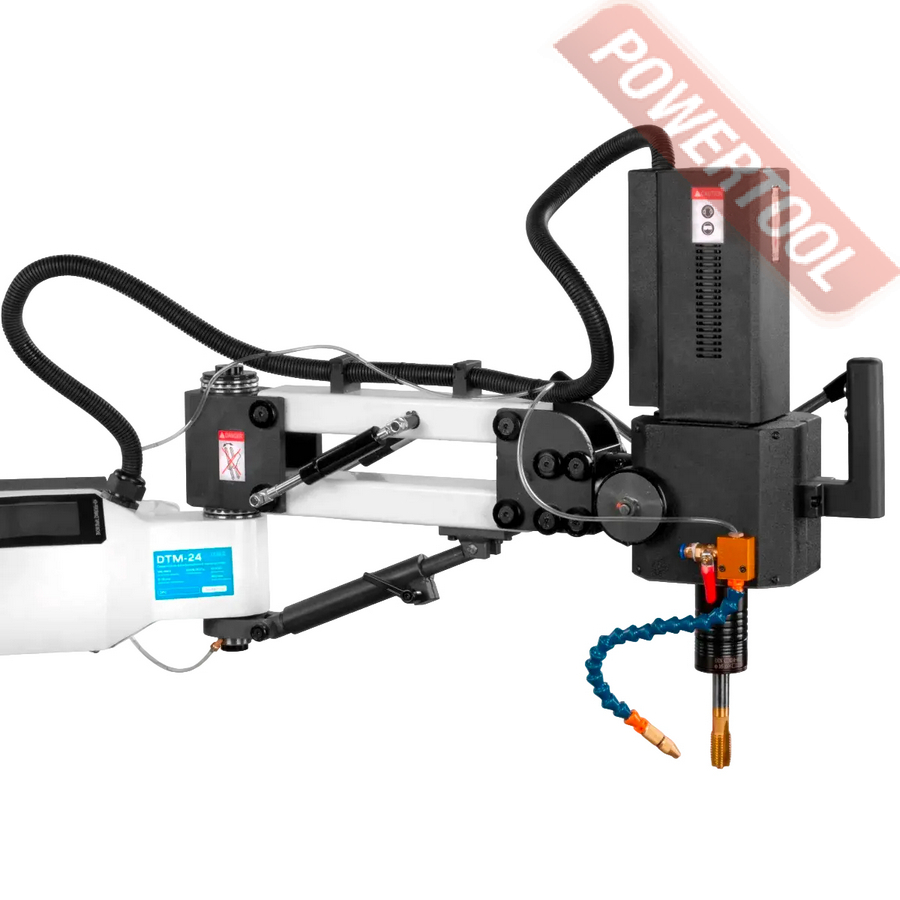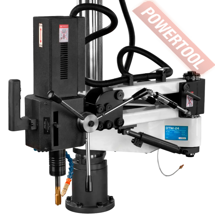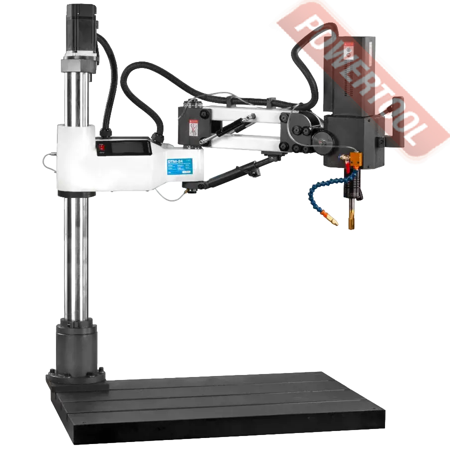 Сверлильно-резьбонарезной манипулятор, 1200 Вт, 220 В, max диаметр сверления 16 мм, max нарезаемая резьба M24, частота вращения шпинделя 0-3000 об/мин, 2 передачи, бесступенчатая регулировка оборотов, индикация числа оборотов, режимы ручной/авто/нарезка глубокой резьбы, посадочное сверлильного патрона B16, диапазон хвостовиков для патрона 3-16 мм, рабочий радиус поворота рычага 920 мм, в комплекте патрон ключевой B16 3-16 мм, оправка GTM-24/B16, набор резьбонарезных головок GTM-24 DIN 371 М5-М6/М8/М10, DIN 376 М12/M16/M18/M22-M24 с ключом, стойка опорная, крепежные принадлежности, система СОЖ, верстак.