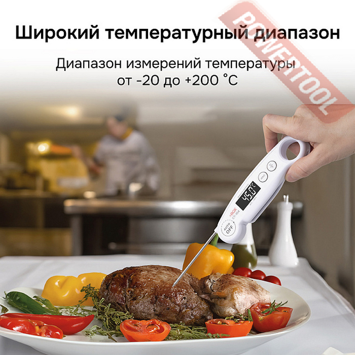 Оболочка зонда изготовлена из химически нейтральной нержавеющей стали AISI 304, благодаря чему устройство подходит для работы с пищевыми продуктами, в том числе для контроля соответствия температурных условий при их тепловой обработке. За счет более тонкой передней части измерителя инструмент способен легко прокалывать мясо и плотные материалы, оставляя после этого малоразмерное отверстие, не ухудшающее товарный вид кулинарных изделий.