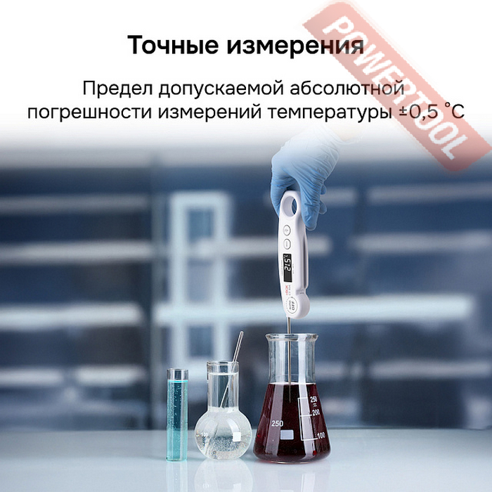 Термометр контактный пищевой RGK CT-104 с поверкой выполнен в виде складывающейся конструкции, благодаря чему обладает компактными размерами в нерабочем положении. Предназначенный для контактных измерений внутренней температуры жидких, вязких, сыпучих и прочих веществ, прибор оборудован тонким погружным зондом длиной 112,6 мм и диаметром в основной части 3,5 мм. В качестве сенсора в данном изделии используется термопара, за счет чего обеспечивается высокое быстродействие и точность измерителя.
