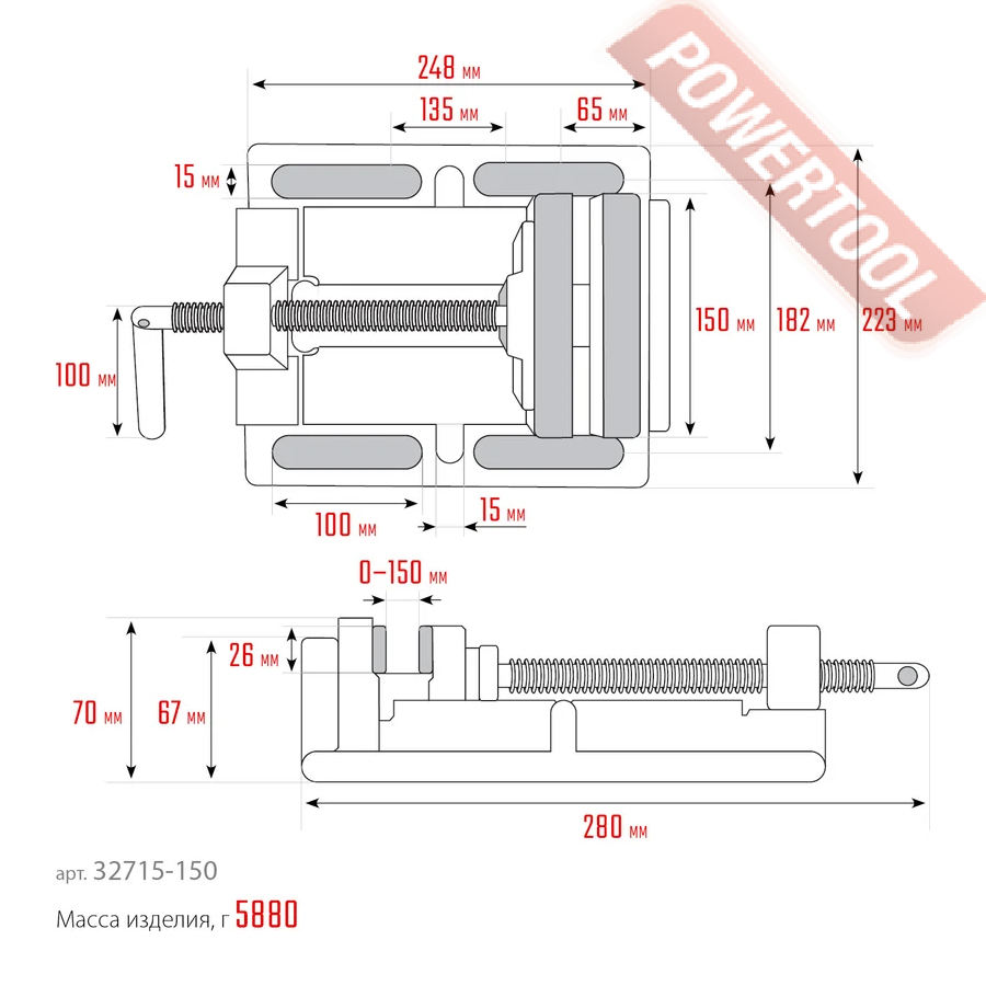 Тиски станочные сверлильные, ширина губок 150 мм, рабочий ход 150 мм, высота губок 26 мм, размер ДхШхВ 280х223х70 мм, вес 5,88 кг.