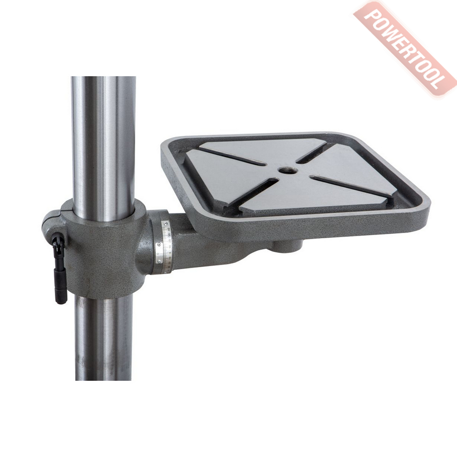 На основание установлена колонна диаметром 80мм с зубчатой рейкой для возможности перемещения стола по вертикали. Рабочий стол, как и основание, изготовлен из качественного чугуна, его размер 315х315 мм с 4-мя Т-образными пазами, расположенными крест-накрест, ширина пазов 15мм. Максимальное расстояние между шпинделем и основанием составляет 1220 мм, а расстояние между шпинделем и рабочим столом – 720 мм.